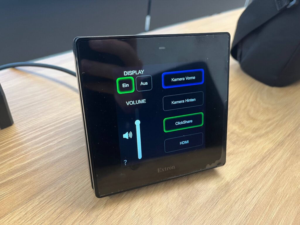 Die Bedienung wurde über die Extron MLC Plus 400 als zentrale Mediensteuerung bewusst vereinfacht umgesetzt, mit Ein- und Ausschaltung sowie Lautstärkeregelung. Sie vereint Touchpanel und Steuerungscontroller in einem System.