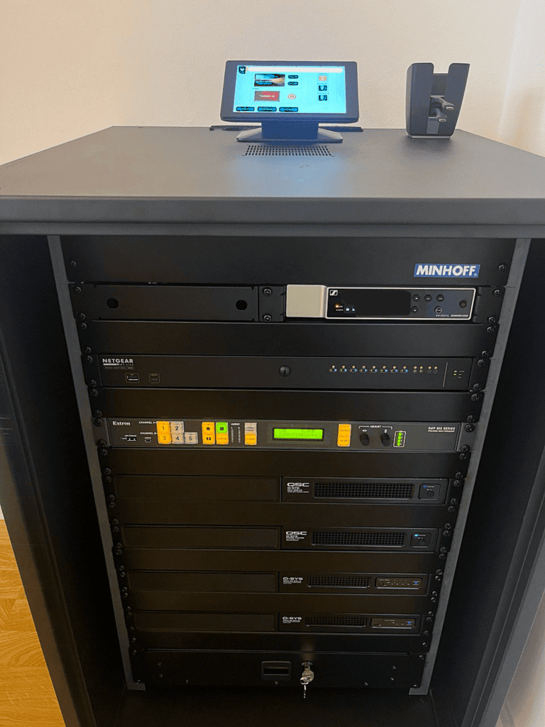 Die Signalverarbeitung und Steuerung laufen in einer Q-SYS Anlage zusammen, die Audio, Video und Bedienlogik bündelt. Das zentrale Touchpanel bietet eine übersichtliche und intuitive Bedienoberfläche. Das Technikrack wurde vollständig bestückt und strukturiert verkabelt im hinteren Bereich des Raumes installiert.