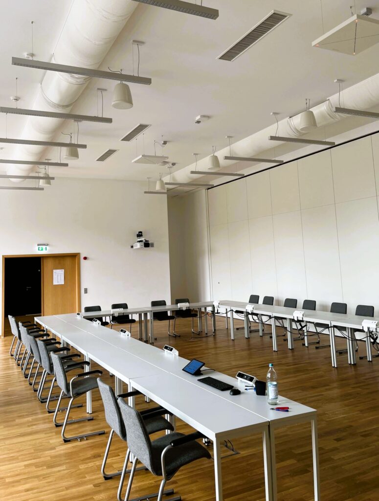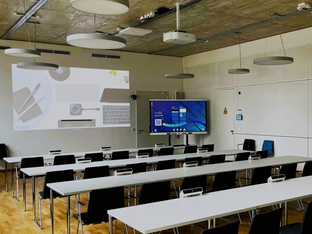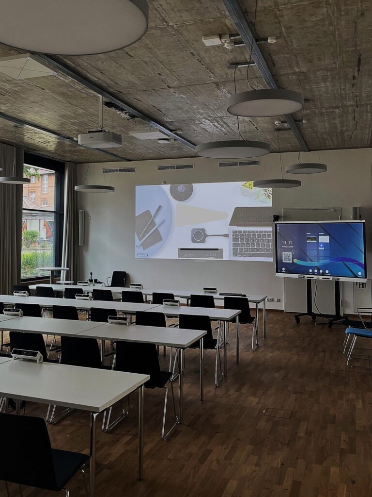 Infolge einer brandschutzbedingten Planänderung mussten innerhalb kurzer Zeit mehrere neue Seminarräume eingerichtet werden. Ziel war es, eine moderne, zukunftsfähige Infrastruktur zu schaffen, die sowohl klassische Vortragssituationen als auch hybride Konferenzformate zuverlässig unterstützt. Dabei sollte die Bedienung für Nutzerinnen und Nutzer so einfach wie möglich bleiben.