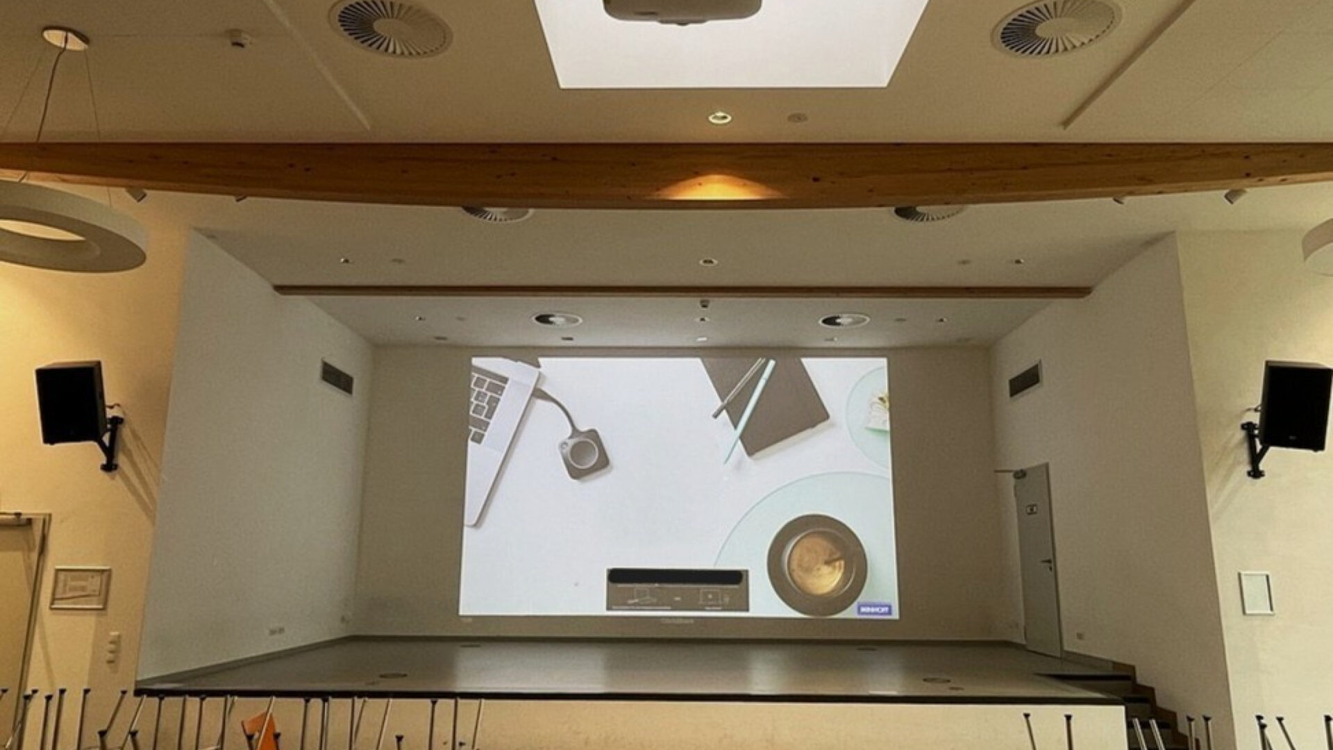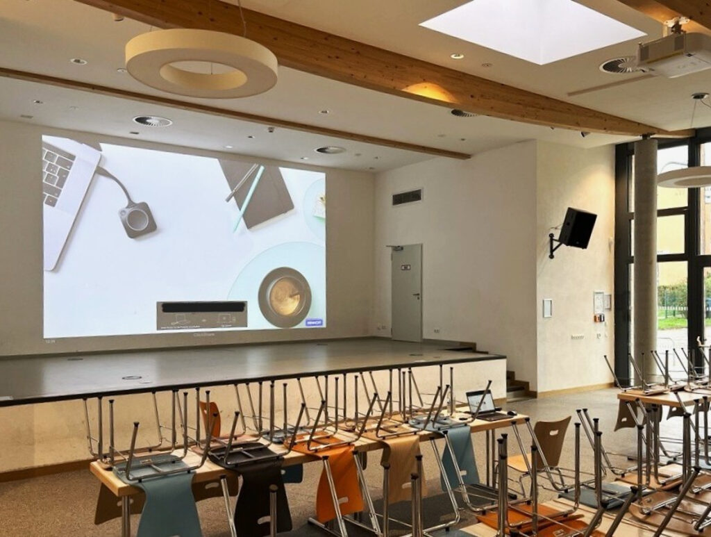 In einem neu errichteten Multifunktionsgebäude sollte eine leistungsfähige Präsentationslösung geschaffen werden. Bisher fehlte eine geeignete Projektion, die sowohl für Veranstaltungen am Tag als auch für größere Gruppen nutzbar ist.